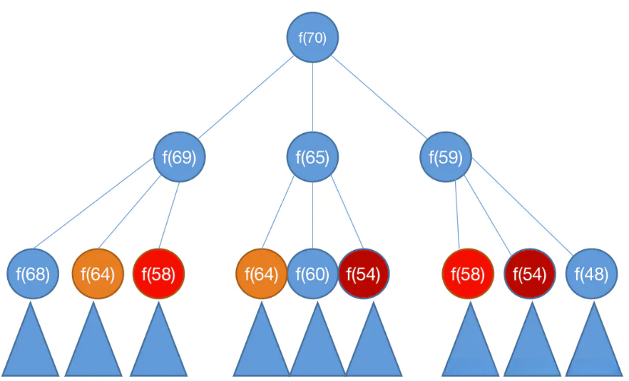 以红色标注的形式呈现的是同一类别的特定函数实例,在具体案例中包含了如f(64)、f(58)以及f(54)等实例均为重复运算的结果;这些仅占整个计算系统的一个小部分;然而目前系统中存在大量冗余的计算任务难以直观呈现