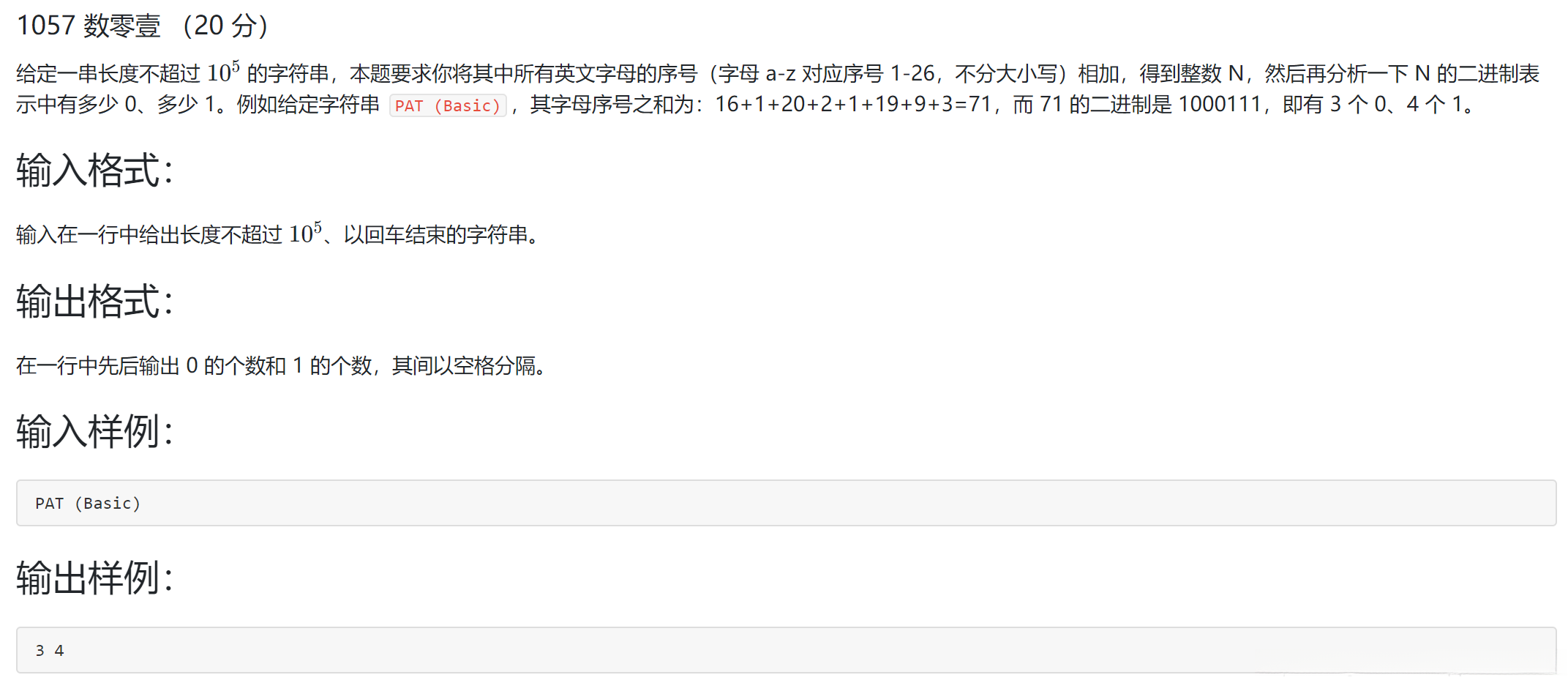 本题中,如果字符串中没有任何一个英文字母,我们应该输出什么呢?显然这时整数N应该为0,为什么说应该为0呢?因为题目并没有明确说字符串中没有任何一个英文字母时N的值应该是多少。按照本题的测试程序,测试点2就是字符串中没有任何一个英文字母的情况,这个时候我们应该输出"0 0",即把0和1的个数均看作是0。