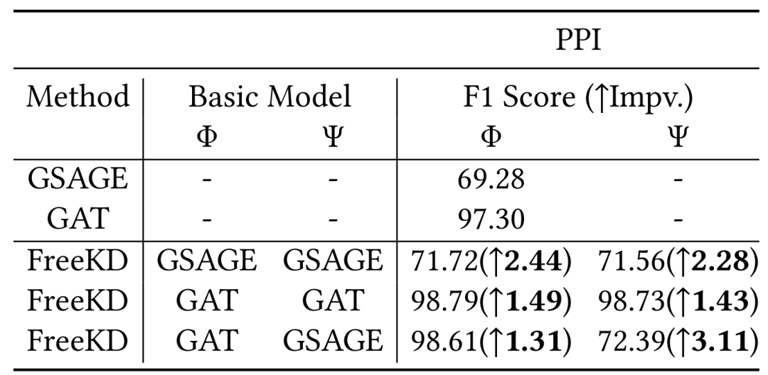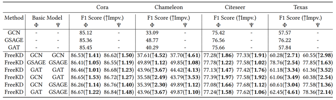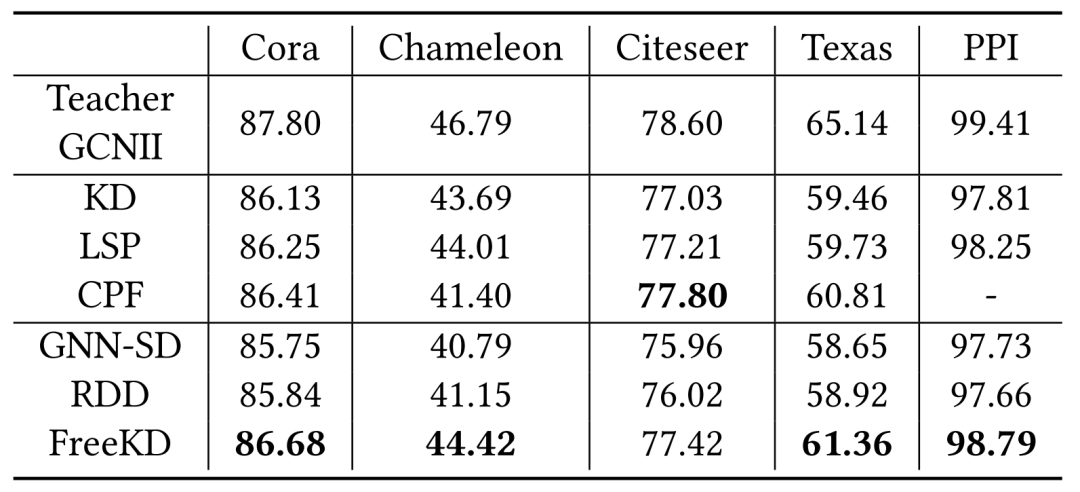 上表详细列出了对比实验结果,表明FreeKD在各数据集上的应用表现不低于并略胜于传统知识蒸馏方法(KD、LSP、CPF)。这不仅验证了FreeKD的性能优势,还表明其在知识获取方面具有显著的优越性。值得注意的是,FreeKD通过从更强大的GCN教师那里获取知识,实现了这一优势,而其独特的知识提取机制仅在两个较浅的GAT之间进行知识交互。此外,FreeKD在性能上持续优于GNN-SD和RDD,这一结果进一步验证了FreeKD的有效性和优越性。