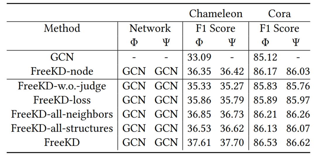 • FreeKD-w.o.-judge:FreeKD不使用代理,Φ和Ψ从彼此中提取每个节点的知识。
