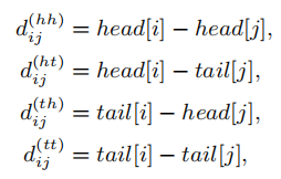 span是字符和词汇的总称,span之间存在三种关系:交叉、包含、分离,然而作者没有直接编码这些位置关系,而是将其表示为一个稠密向量。作者用head[i]和tail[i]表示span的头尾位置坐标,并从四个不同的角度来计算xi和xj的距离: