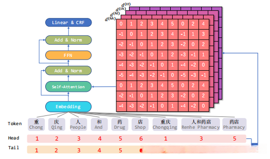 FLAT给每一个token/span(字、词)增加了两个位置编码,分别表示该span在sentence中开始(head)和结束(tail)的位置,对于字来说,head position和tail position是相同的。这样扁平的结构允许我们使用Transformer Encoder,其中的self-attention机制允许任何字符和词汇进行直接的交互。
