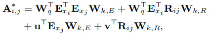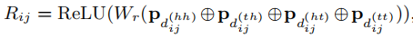 表示x[i]的开始位置和x[j]的开始位置的距离。然后将这四个距离拼接后作一个非线性变换,得到x[i]和x[j]的位置编码向量R[i,j]: