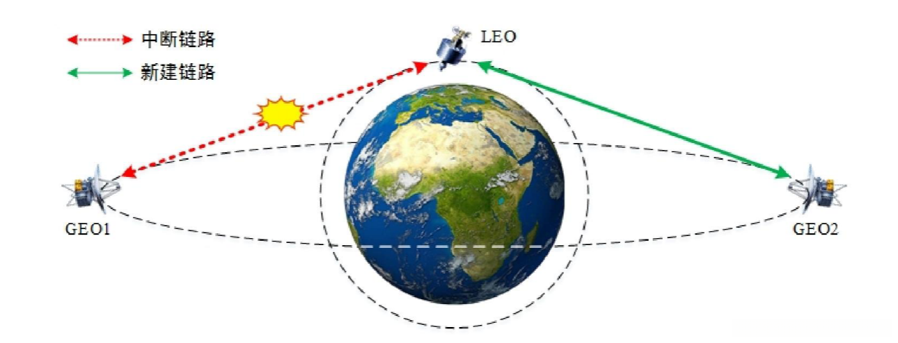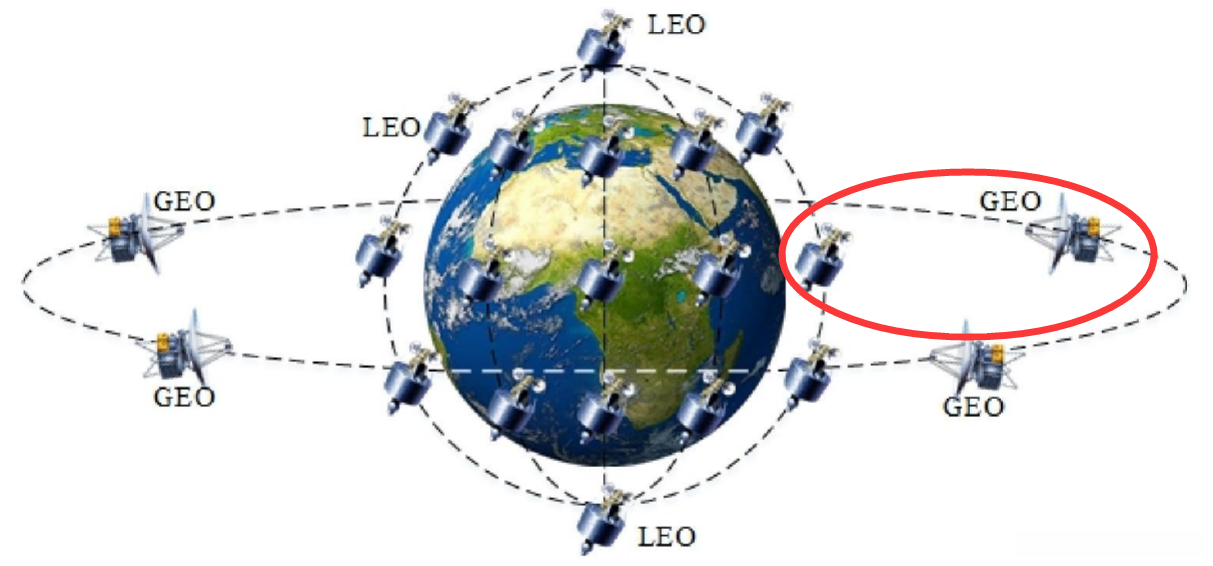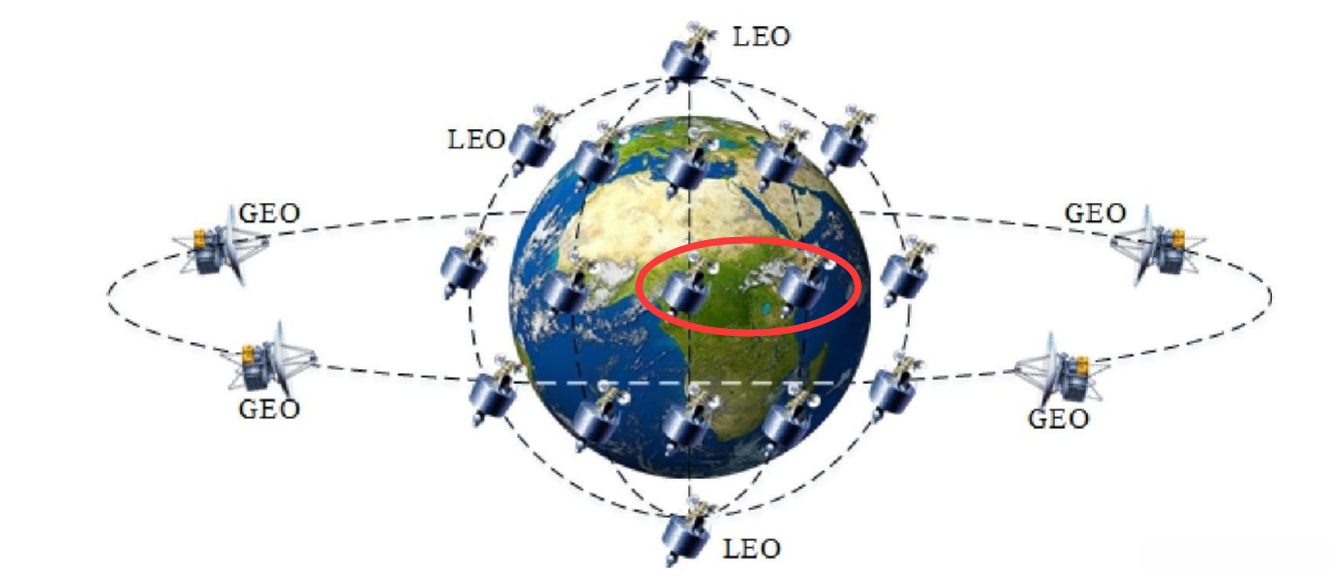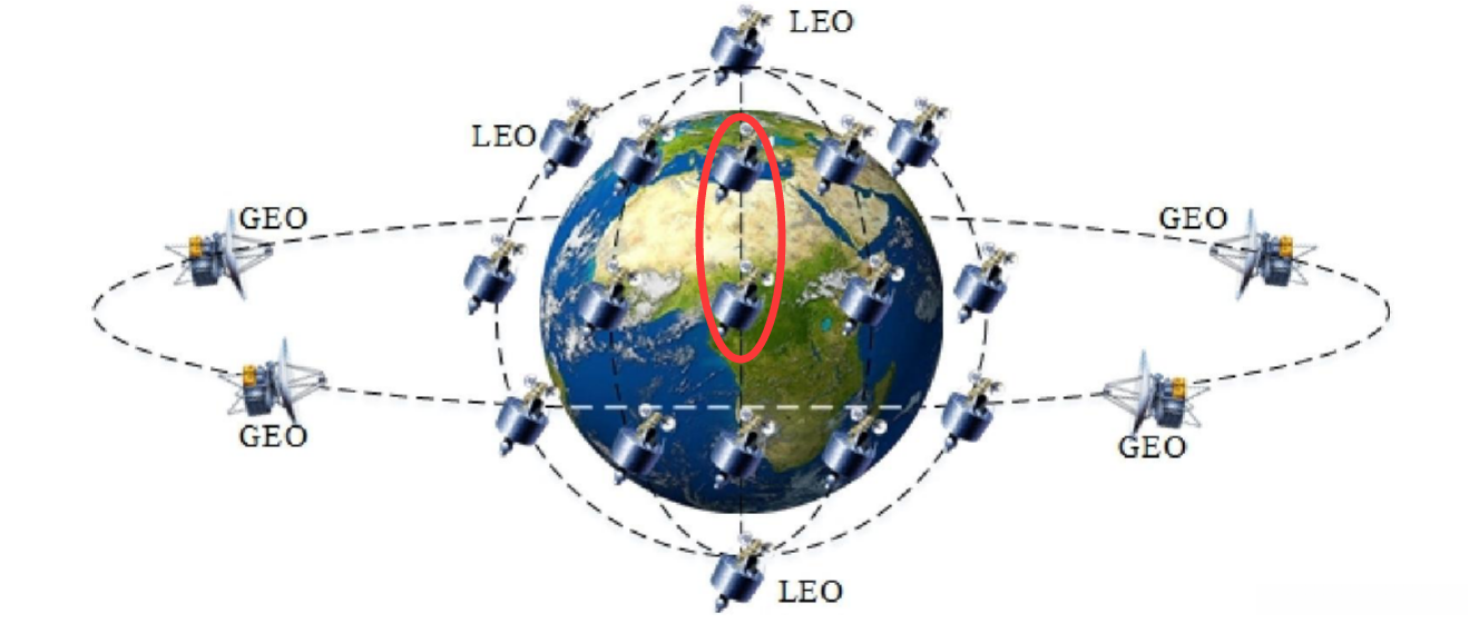 对象: 双层卫星网络,通常由地球同步轨道卫星(GEO)和低地球轨道卫星(LEO)组成,其中GEO在通信中起到中继器的作用,能够提供广域覆盖区域,但其传输时延较高,LEO具有较低的传输时延和较高的带宽,能够支持实时通信和高速数据传输。