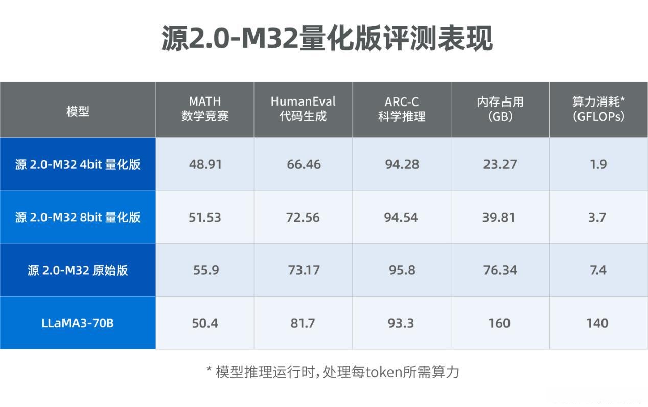 源2.0-M32大模型发布4bit/8bit量化版! 运行显存仅需23GB,性能可媲美LLaMA3