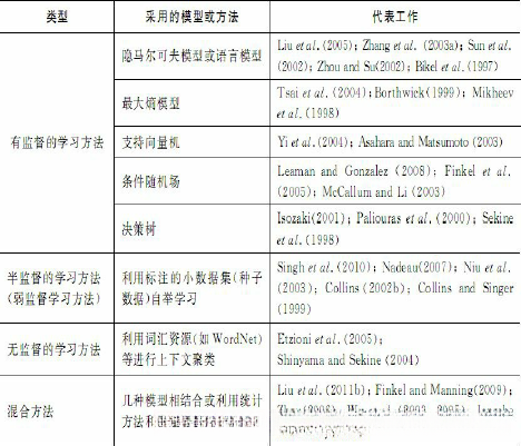 自20世纪90年代后期以来,尤其是进入21世纪以后,基于大规模语料库的统计方法逐渐成为自然语言处理的主流,一大批机器学习方法被成功地应用于自然语言处理的各个方面。根据使用的机器学习方法的不同,我们可以粗略地将基于机器学习的命名实体识别方法划分为如下四种:有监督的学习方法、半监督的学习方法、无监督的学习方法、混合方法。下表对这些方法进行了简要归纳。