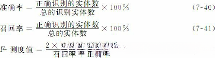 系统性能表现主要通过准确率(precision,简记为P)、召回率(recall,简记为R)和F-测度值(F-measure,简记为F)3个指标来衡量,计算公式分别如式(7-40)、式(7-41)和式(7-42)所示: