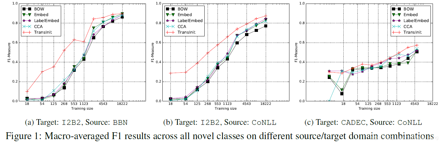 (2)为了测试目标域训练数据大小对结果的影响,我们基于对数标度将CADEC和I2B2的训练集分成10个分区,并通过将这些分区从最小值合并到最大值来创建10个连续更大的训练集(最终合并是完整的训练集)。对于所有方法,我们仅报告对目标域新的NE类的宏观平均F1。