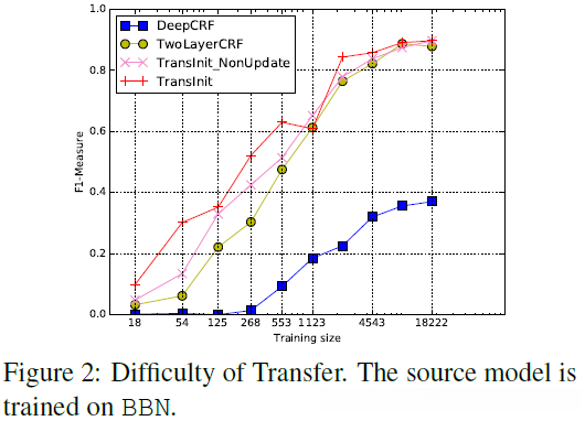 - TransDeepCRF:三层深CRF。底层是用来自源域训练的CRF的Ws初始化的线性层。中间层是hard tanh函数(Collobert等,2011)。顶层是线性链CRF,所有参数都初始化为零。