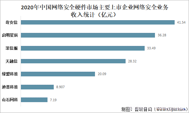 从网络安全业务收入来看,2020年奇安信网络安全业务收入为41.54亿元;启明星辰网络安全业务收入为36.28亿元;深信服网络安全业务收入为33.49亿元;天融信网络安全业务收入为28.32亿元;绿盟科技网络安全业务收入为20.09亿元;迪普科技网络安全业务收入为8.907亿元;山石网科网络安全业务收入为7.19亿元。