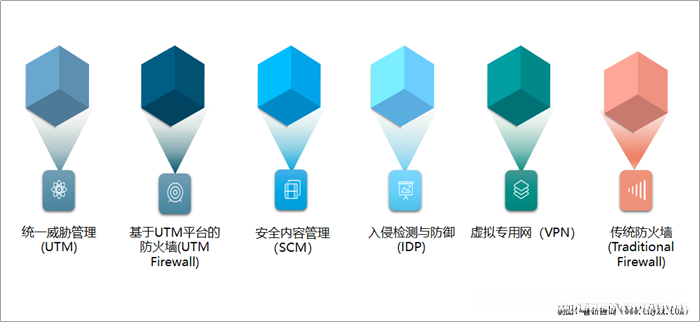 网络安全硬件市场分别由统一威胁管理(UTM)、基于UTM平台的防火墙(UTM Firewall)、安全内容管理(SCM)、入侵检测与防御(IDP)、虚拟专用网(VPN)、传统防火墙(Traditional Firewall)构成。