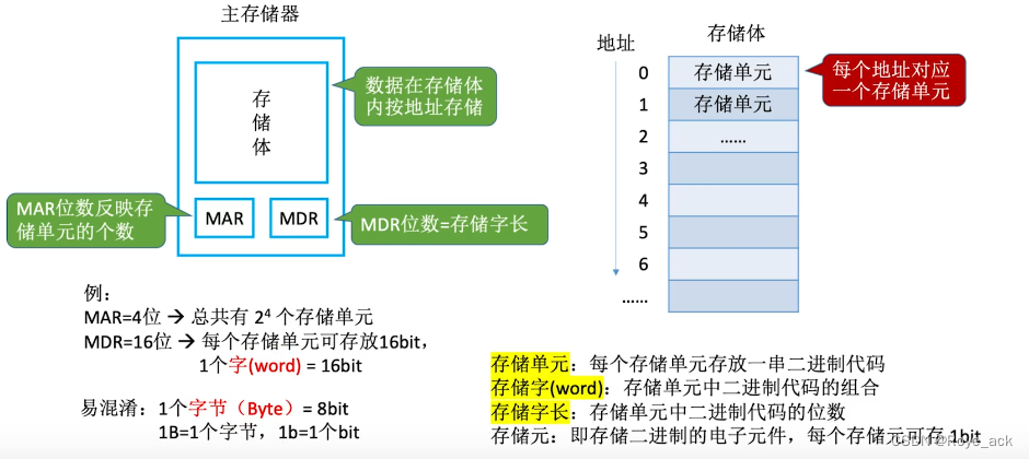 - MDR:位数反映存储字长(存储字长=存储单元二进制码的位数)