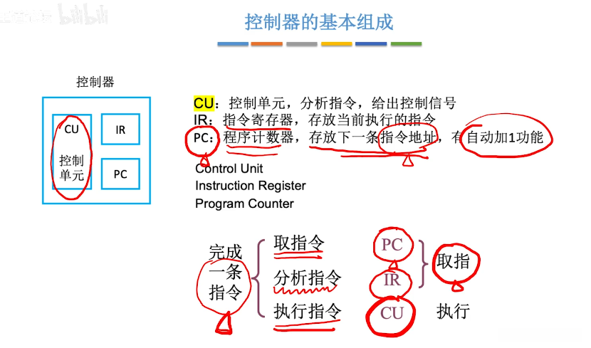 - 控制器由PC程序计数器、IR指令寄存器、CU控制单元组成