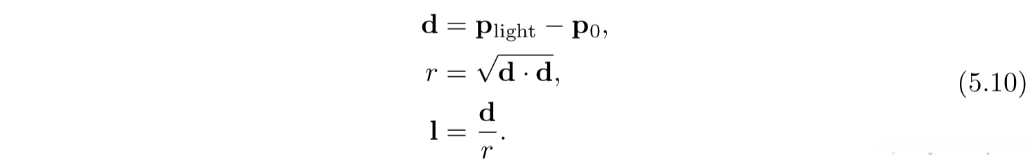 从公式5.3到5.6可以看出,一个光源影响着色模型靠两个参数:指向光源的向量l和光颜色Clight。有多种不同类型的光源,它们的主要区别在于这两个参数在场景中的变化方式。