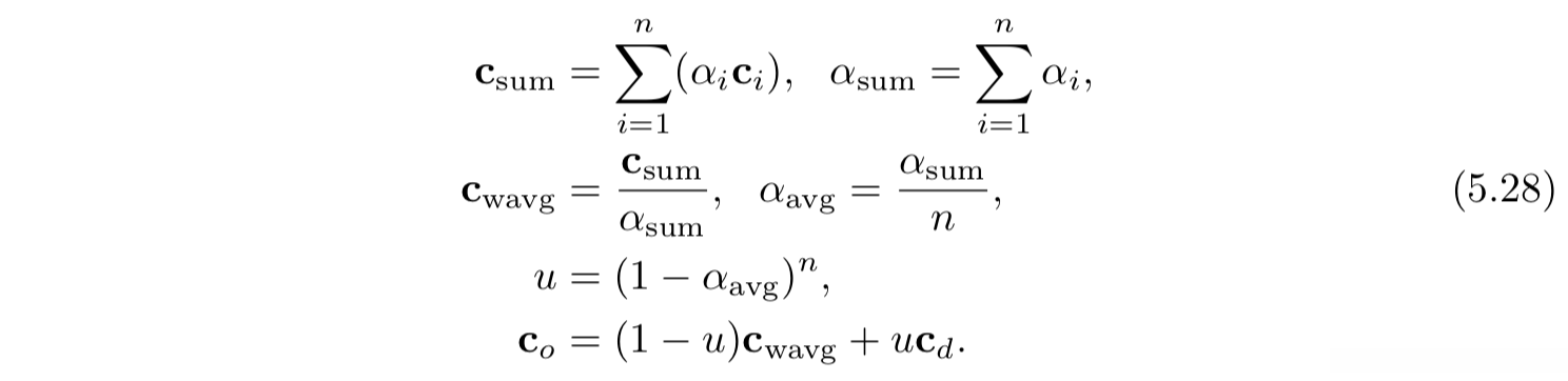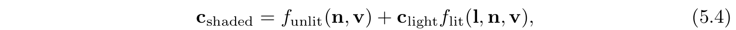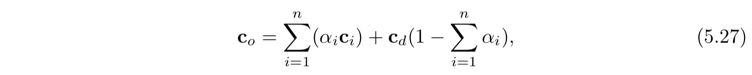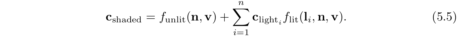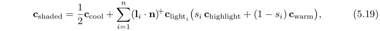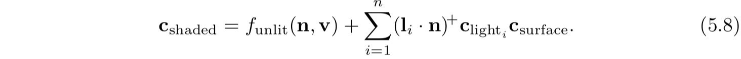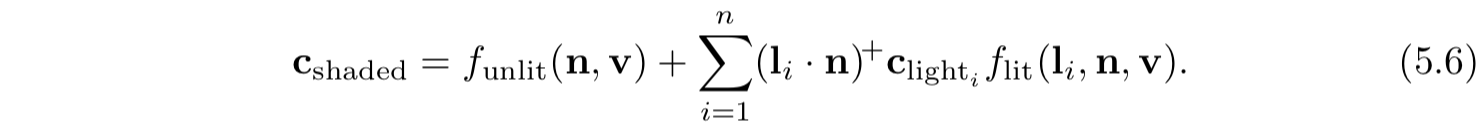 支持多光源的着色模型通常使用的是公式5.5(更通用)或公式5.6(需要基于物理的模型)。公式5.6对于一些风格化着色模型也有用,因为它可以帮助确保光照的整体一致性,特别是对于背离光源或处于阴影中的表面。当然也有一些并不是适用,而这些模型则可以使用公式5.5。