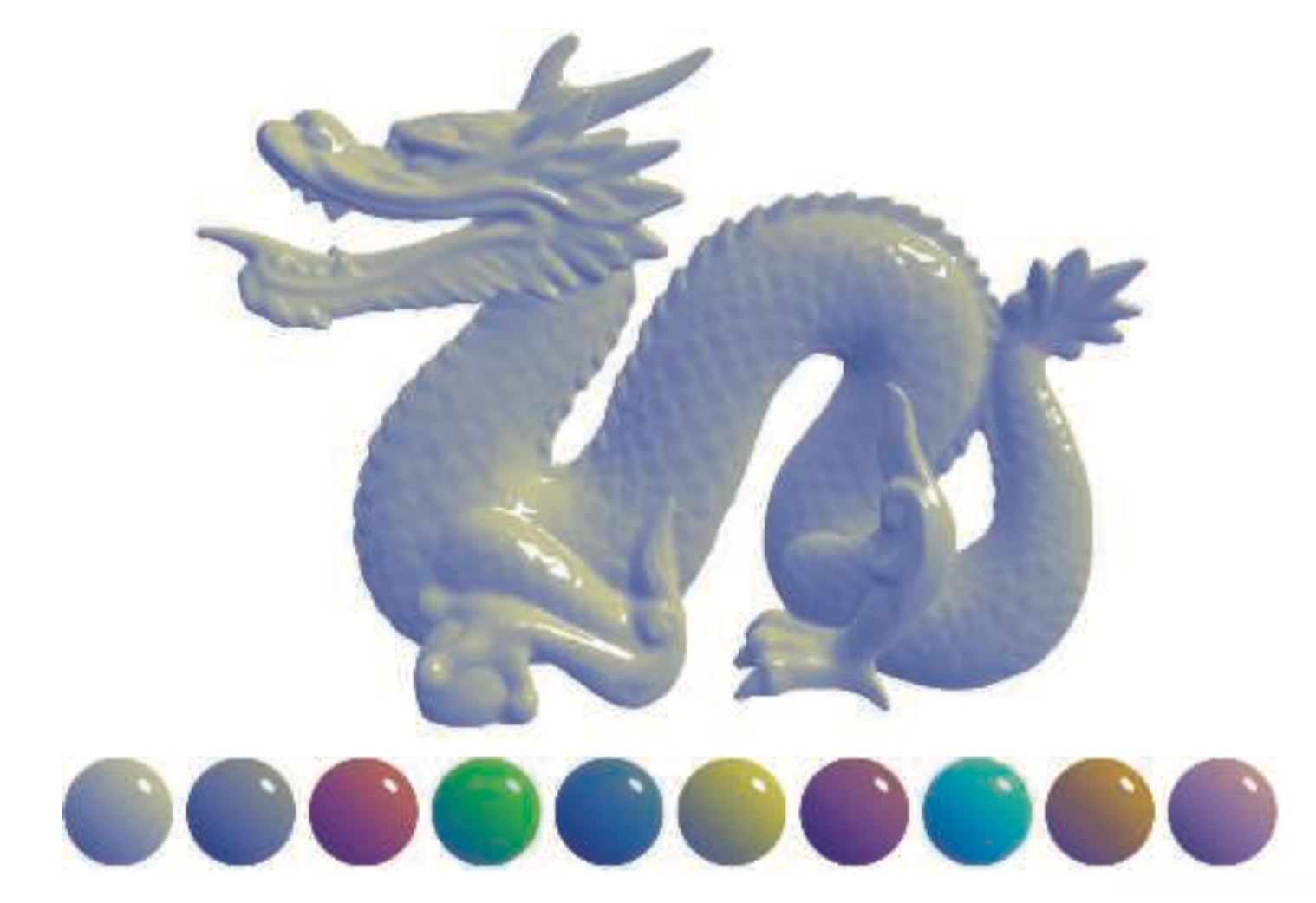 着色模型通常有可以控制外观变化的属性。渲染一个物体外观的第二步就是设置这些属性值。本例中,渲染模型只有一个属性,即表面颜色,如图5.2下图所示。