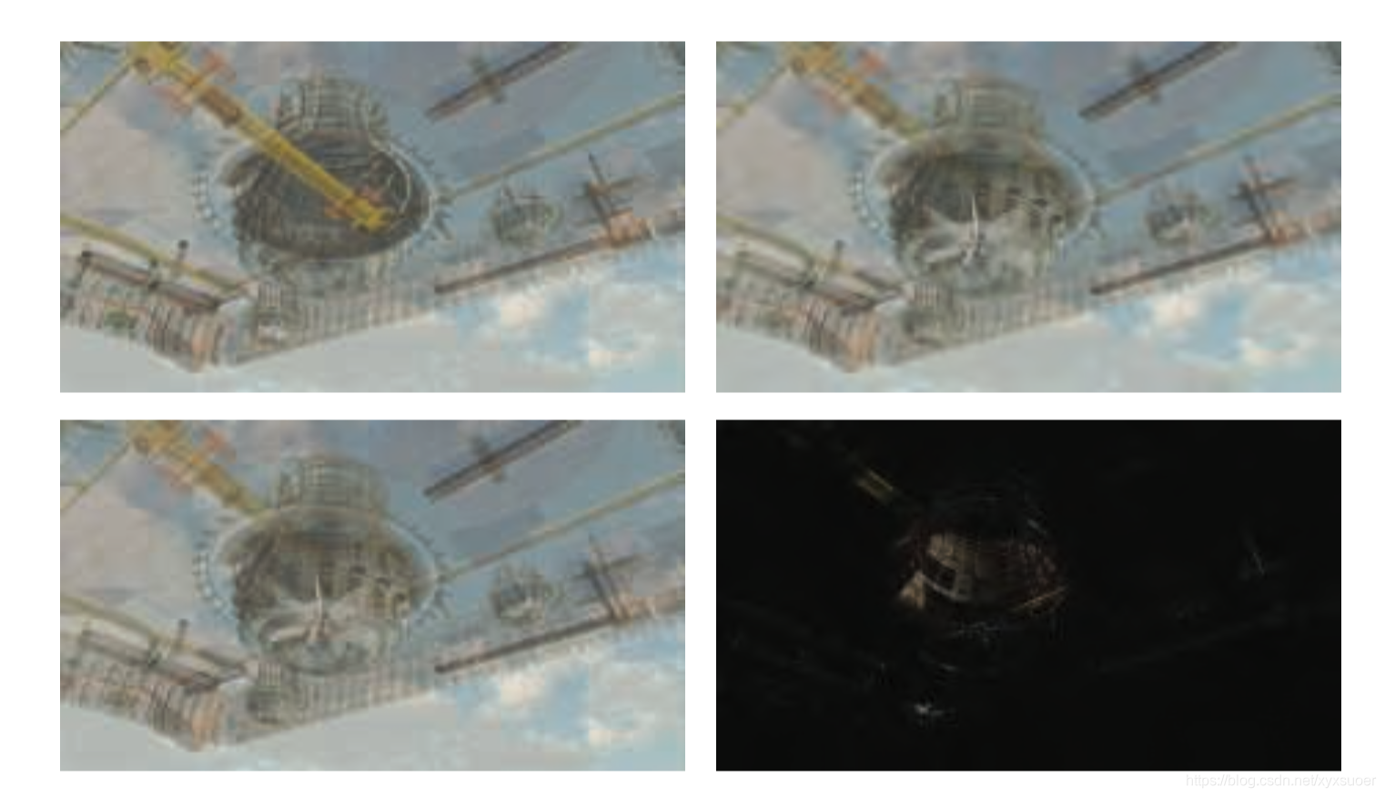 图 5.36 左上图是传统的从后到前的alpha混合,因为排序不对导致渲染错误。右上图使用了A-buffer,效果正确,是非互动结果。左下图使用的是多层alpha混合(mult-layer alpha blending)。右下图展示的是A-buffer和多层alpha混合的区别,为了可见乘以了4.