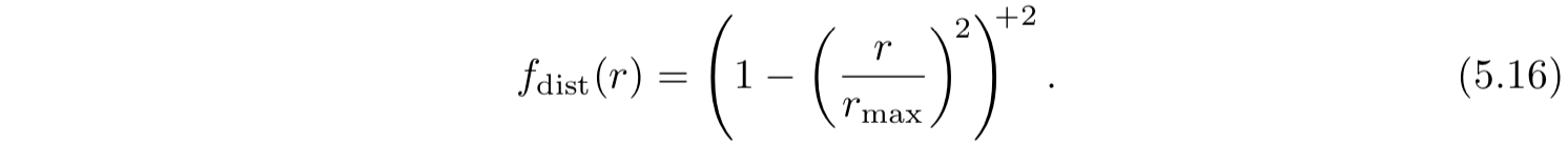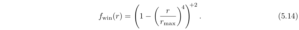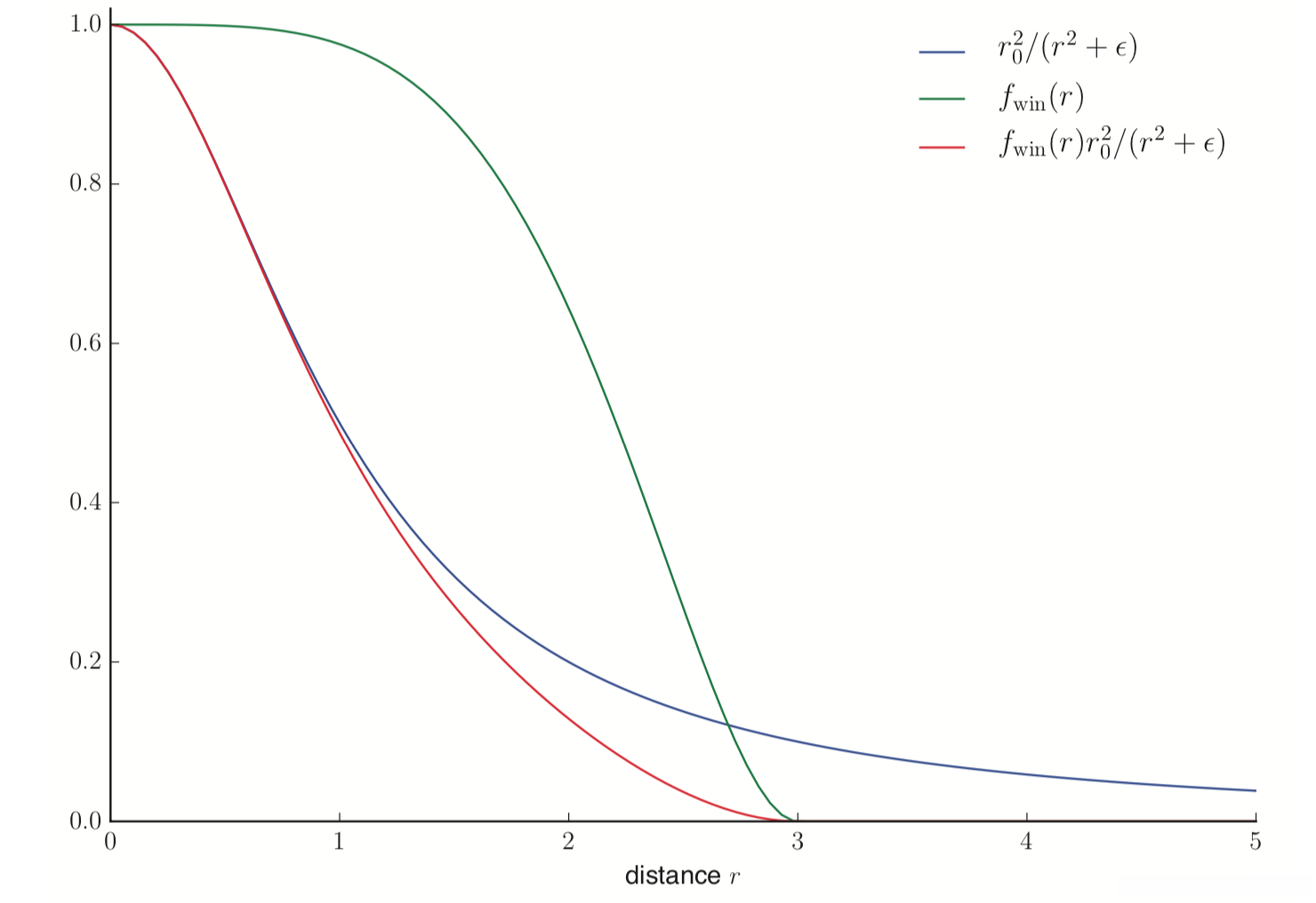 图 5.6 展示了平方反比曲线(利用 ε方法来避免出现除0的情况, ε =1 ),窗口函数曲线(采用的是公式5.14所示,其中 r max 设为3)以及两者结合在一起的曲线。