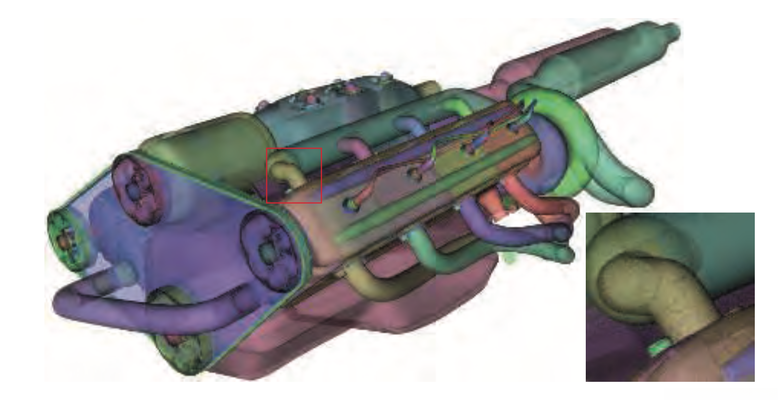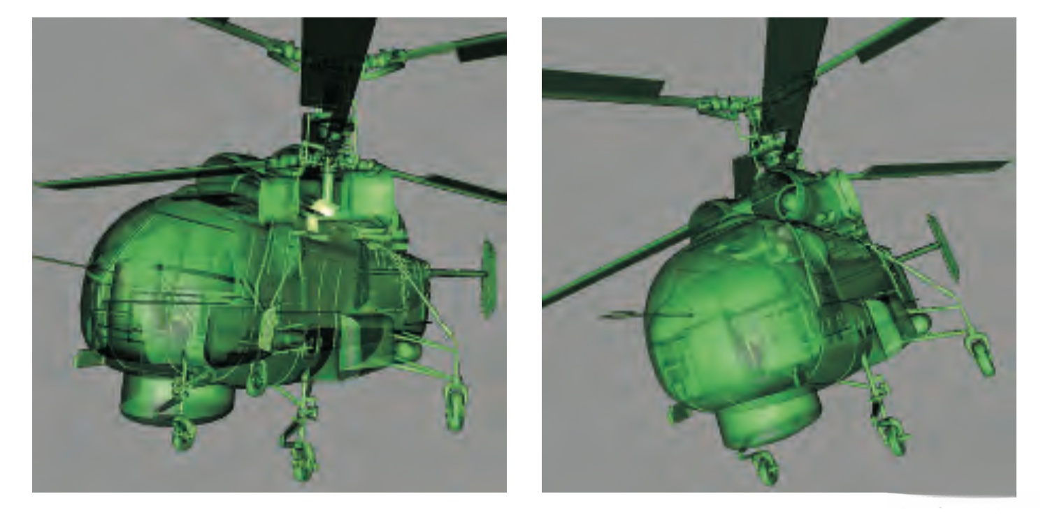 图 5.38 两个不同摄像机观察同一个引擎模型,都采样的是加权混合与顺序无关透明算法(weighted blended order-independent transparency)。按距离加权能够弄清哪些面更靠近观察者。