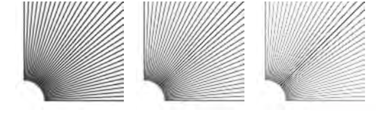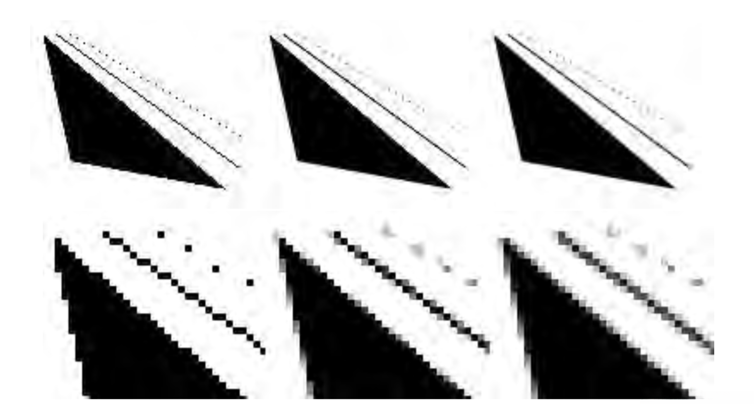 图5.42 左图,反走样的线是经过了伽马矫正的。中间图是经过了部分纠正的,而右边图是完全没有进行伽马矫正的。