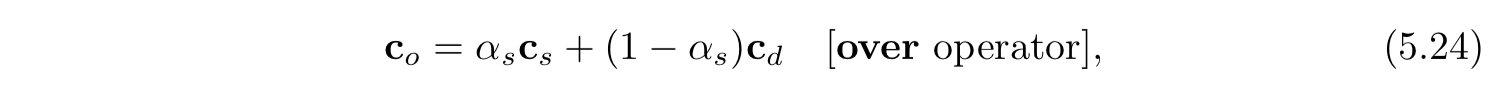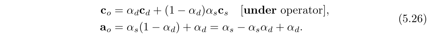 为了使物体看起来半透明,需要把物体渲染在现有场景的最上层,并且它的alpha值得小于1.0。每一个被该物体覆盖到的像素,都会收到一个来自像素着色器的RGBA值,将这个片元的值和混合前的像素颜色使用over算子(over operator) 进行混合,如下: