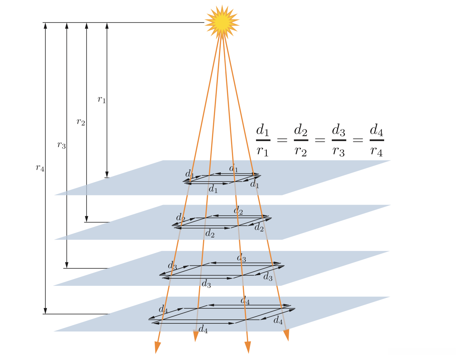 图5.5 点光源发出的光线间的间距与距离r成比例增加,因为光线间的间距同时在二维上增加,因此光线的密度(及光强)和r的平方的反比成正比。