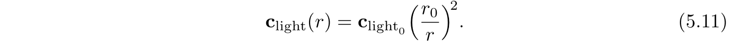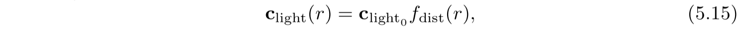 在所有方向上均匀发射光线的精准光源,称为点光源(Point Lights)或泛光源(Omni Lights)。 对点光源,Clight值随着r的增大而衰减。图5.5展示了为什么会衰减,利用了类似于图5.4中的余弦因子进行几何推理。在给定的表面上,来自点光源的光线间的距离和从表面到光源的距离成正比。与图5.4中的余弦因子不同,此间距的增加沿着表面两个维度发生,因此射线密度(及因此引起的光颜色Clight值)与