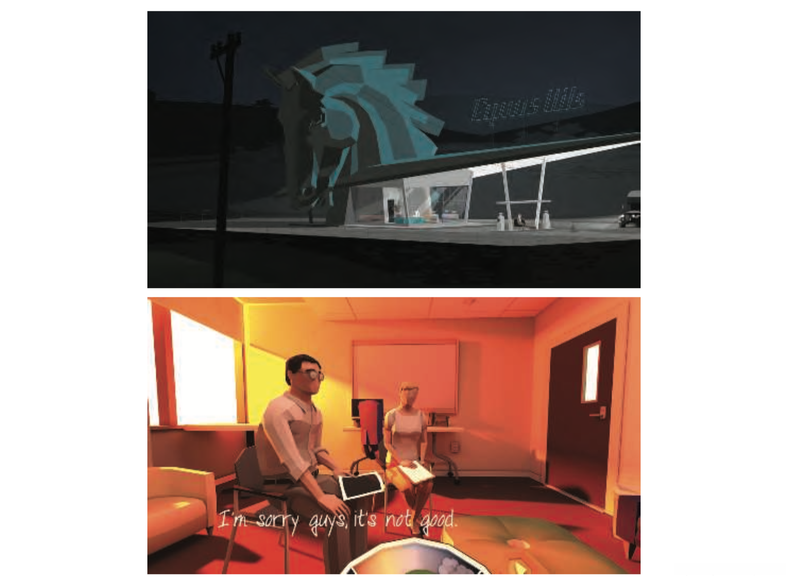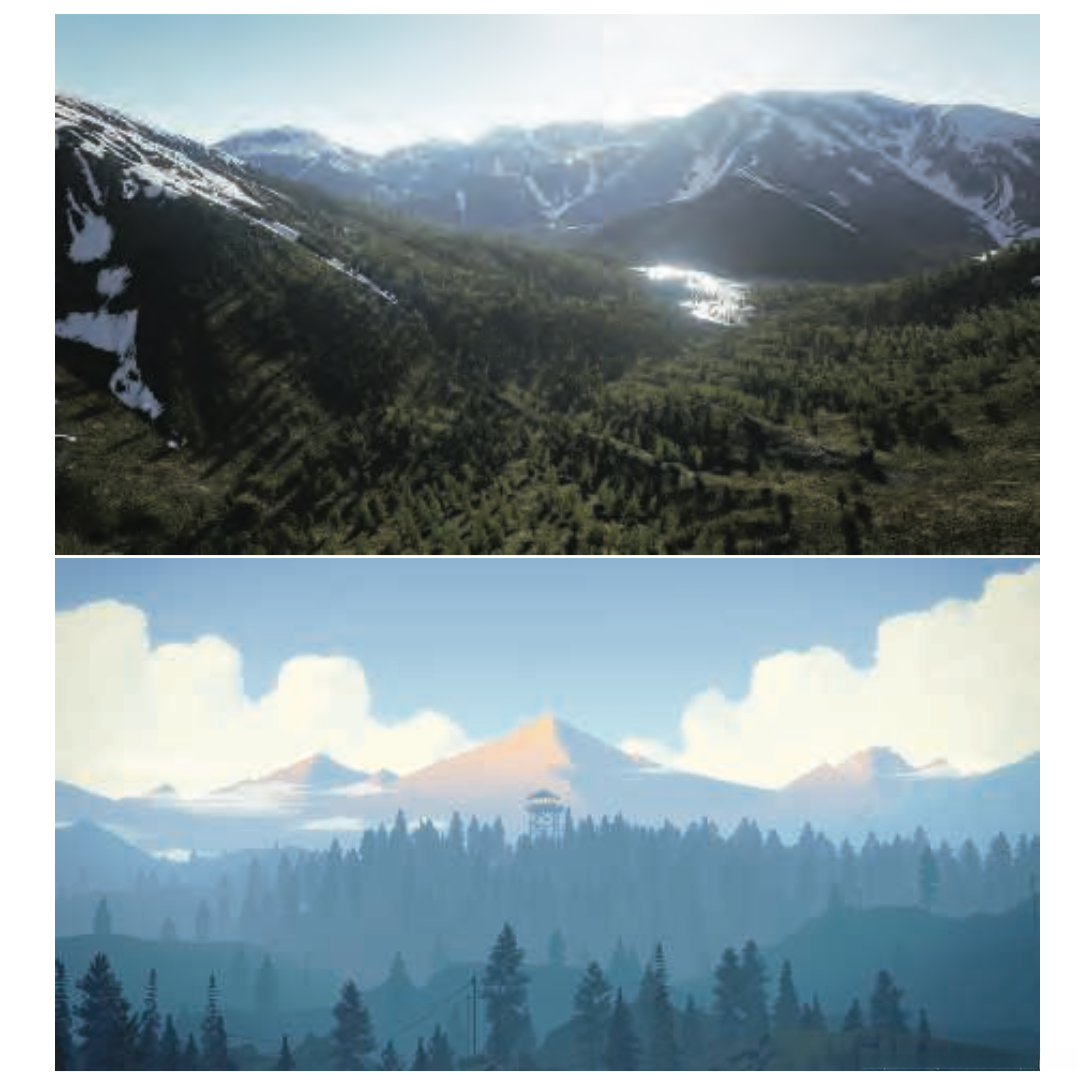 图 5.1 上图是用虚幻引擎渲染的写实山水场景。而下图的渲染用的是Campo Santo,这是专门用来渲染插图风格类型的。