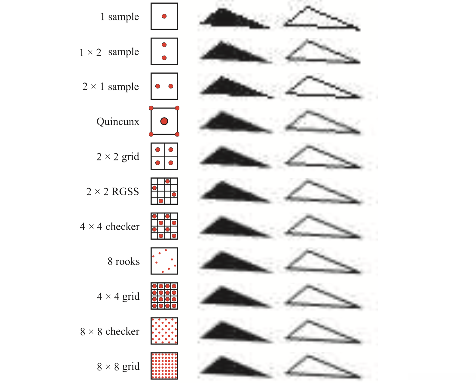 RGSS是一种拉丁超立方体(Latin hypercube) 或N-rooks模式 采样,将n个采样放在nxn网格中,每行和每列一个。在RGSS中,4个采样点分别位于4x4子像素网格的行列上。和常规2x2网格模式相比,这种模式特别适合捕获水平和垂直方向上的边缘。