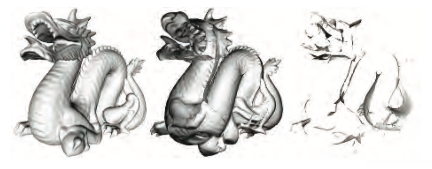 图 5.35 每一个深度剥离的pass都会绘制一个透明层。左图展示的是第一个pass,这层是明显可以肉眼可见的。中间图是第二层,绘制的是第二靠近靠近透明表面,本例中是物体的背面,右图是第三层,是一组第三靠近透明物体的表面。最终结果如图14.33所示。