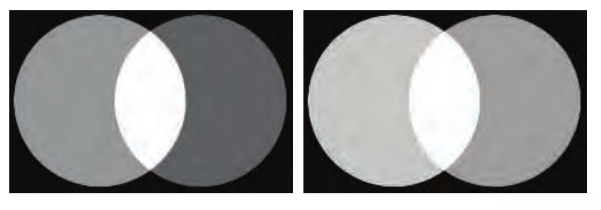 图5.40 两个重叠的聚光灯照亮了一个平面。作图中,在添加完光源(光照度分别为0.6和0.4)之后没有执行伽马矫正,加法是在非线性值上执行,引起了错误。注意,左边的亮度要比右边的亮度高很多,并且重叠部分的亮度不符合实际。右图,在添加完光源之后进行了伽马矫正,灯光本身亮度变得更亮了,重叠部分的亮度也变得合适了。