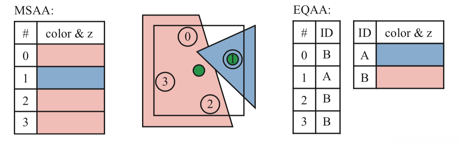 图 5.26 中间图展示的是一个像素被两个物体覆盖,其中红色物体覆盖了三个采样点,蓝色物体覆盖一个采样点,绿色圆点是像素着色的评估位置。因为红色物体覆盖的像素中心,所以像素中心是红色物体像素着色的评估位置,而蓝色物体的像素着色评估位置就是采样点位置。对MSAA来说,每个采样点都自己的颜色和深度值。右图展示的是EQAA的2f4x格式,四个采样点都有对应的ID,并由表格记录了每个ID值对应的颜色和深度值。