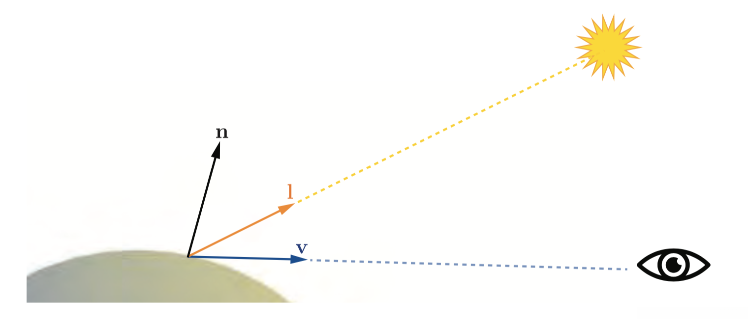 图 5.3 本例着色模型(其实大部分着色模型)的输入用单位向量表示,表面法线 n,观察向量 v,光照方向 l。