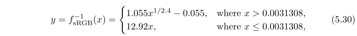 如果你想手动应用sRGB,有标准转换方程或一些简化版本可以使用。实际中,显示器由若干位的颜色通道控制,例如,消费级别的显示器通常是8位,级别范围会是[0,255]。这里将显示编码的级别范围设为[0.0,1.0],线性值得范围也是[0.0,1.0]。我们需要x是线性值,而存储在帧缓冲的y是非线性编码值。为了将线性值转换到sRBG非线性编码值,我们使用到了sRGB显示传递函数的逆: