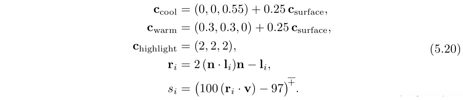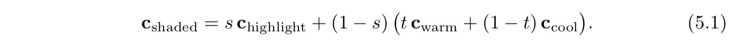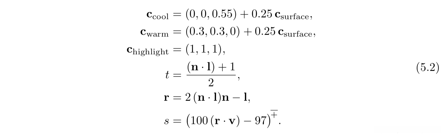 这种方式,在Ca和Cb之间进行插值,随着t从1到0变化,插值结果从Ca到Cb。这个模式在Gooch着色模型中出现了两次,第一次是在Cwarm和Ccool之间进行插值,第二次是将先前插值结果和Chighlight进行插值。线性插值在着色中出现频率很高,在着色语言中有内置函数,称为lerp或者mix 。