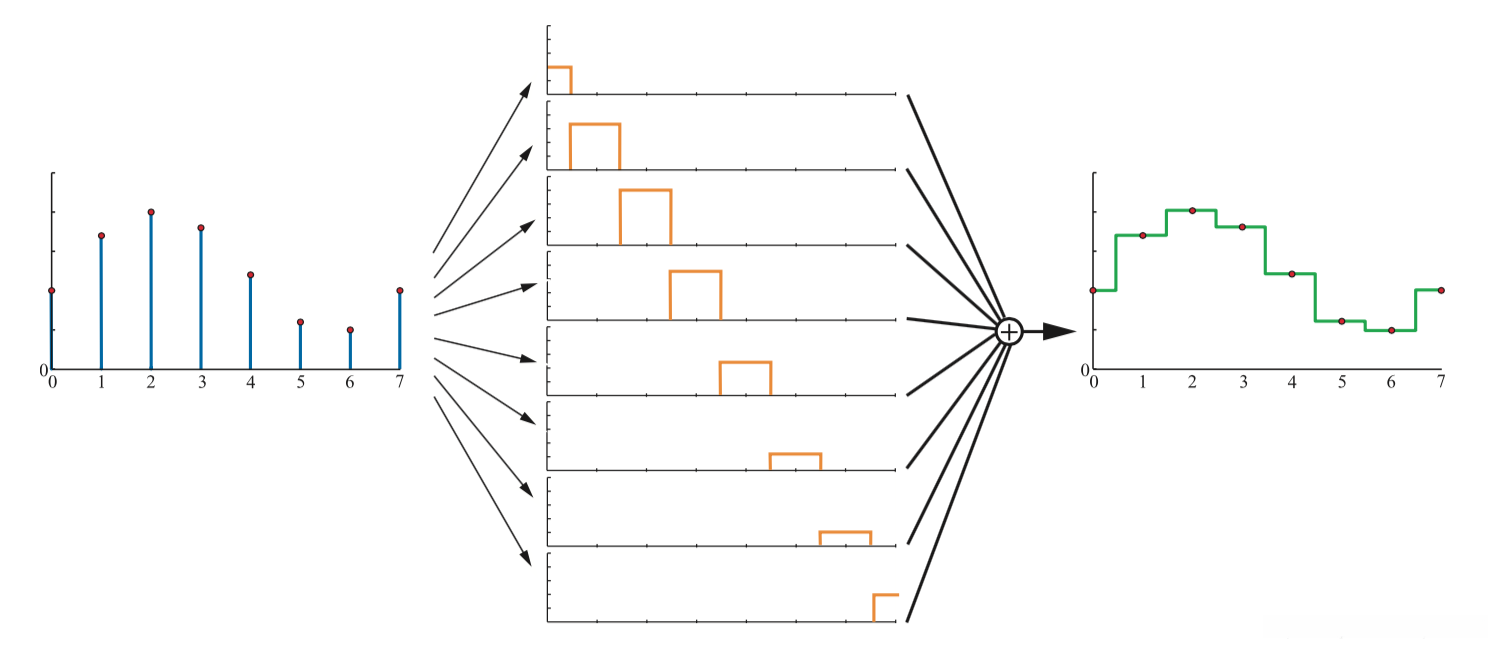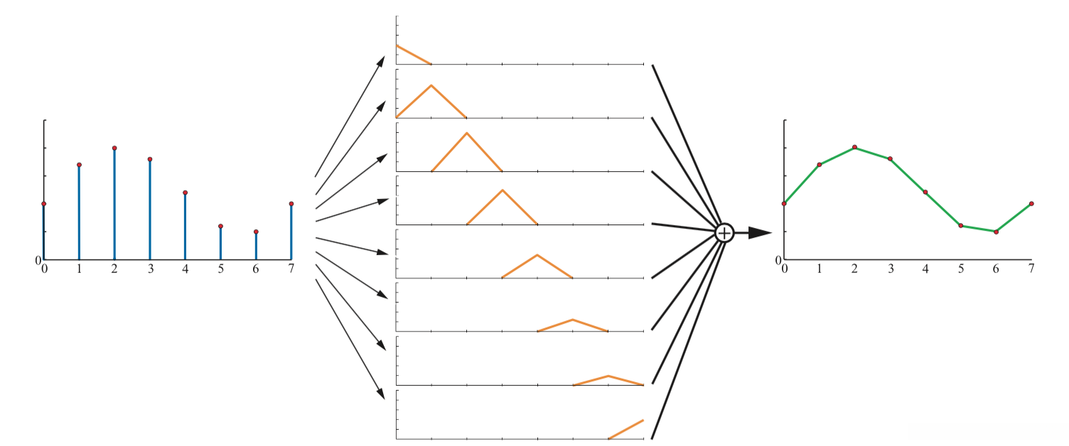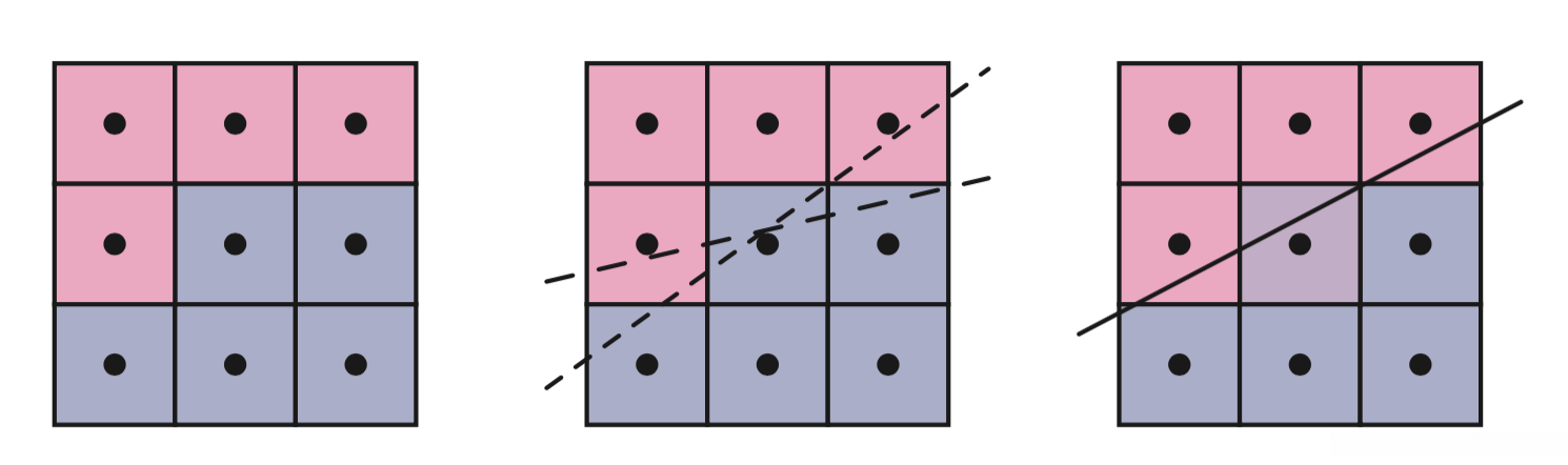 图 5.30形态反走样(morphological antialiasing) 。左图是走样图像。目的是确定边缘可能的方向。中间图展示了通过检测相邻像素来记录是边缘的可能性,给出了两种可能是边缘的示例。在右图,找到最佳猜测边缘,把相邻像素的颜色和当前像素的中心位置的颜色进行混合,混合比例和像素覆盖率成比例。对图中每个像素重复此过程。