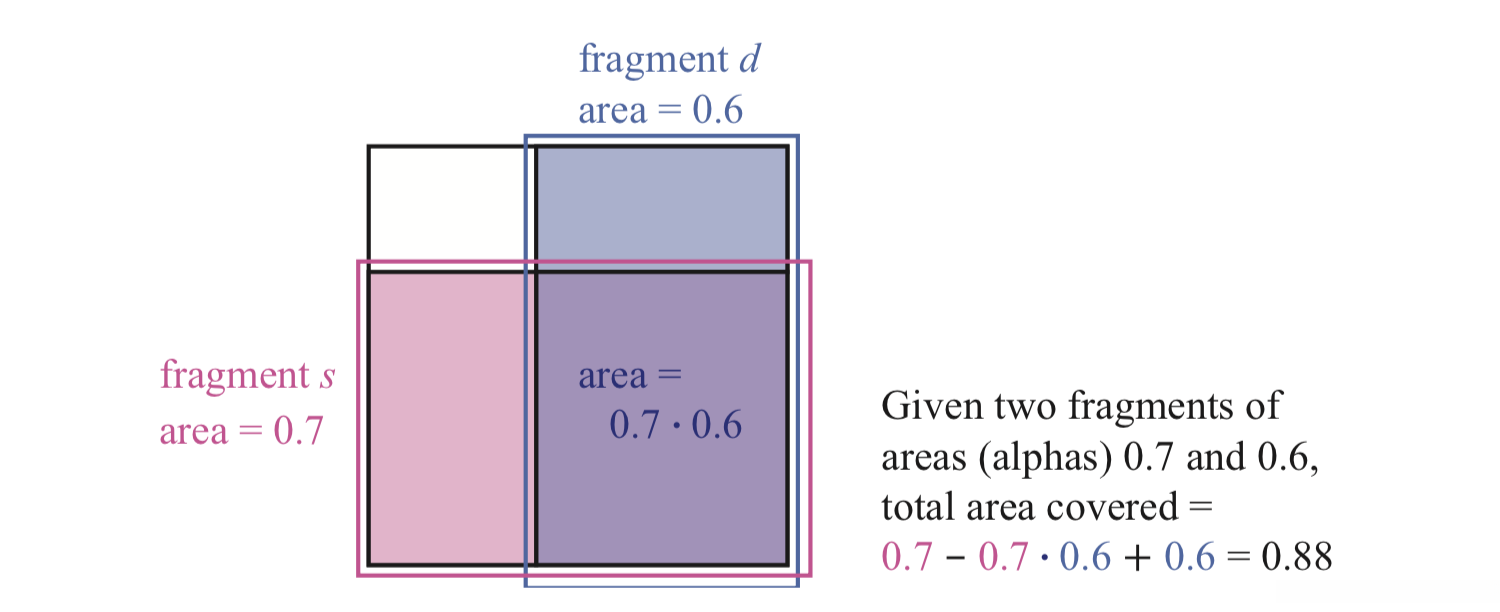图 5.34 一个像素和两个片元,s和d。将两个片元沿不同的轴对齐,两个片元对像素的覆盖率是各自独立的,两个片元都覆盖住的面积可以用公式求出。两个面积相加,然后减去重叠的面积。