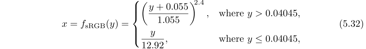 其中,y表示一个规范化的显示通道值,例如存储在图像或帧缓冲中的值,范围在[0.0,1.0]。解码函数是之前用到sRGB公式的逆。解码函数和显示传递函数类似,因为存储在纹理中的值都是被编码过的。