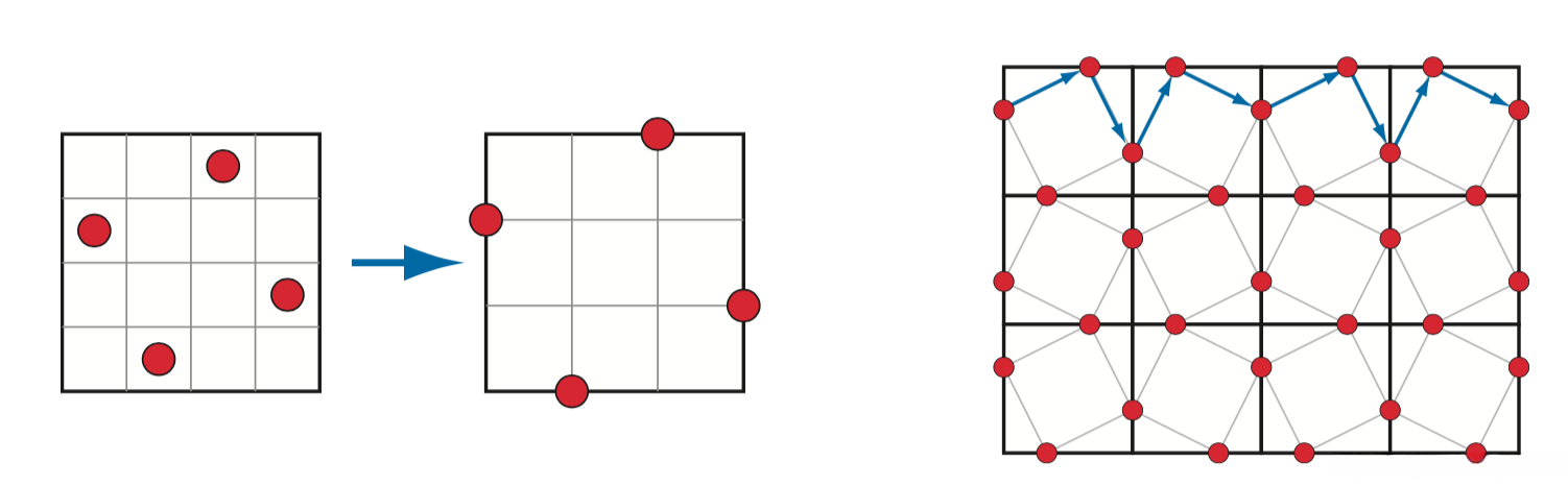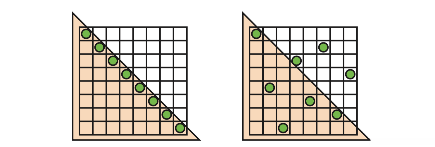 图 5.27 N-rooks采样。左图是一个标准N-rooks模式,但是它在捕获沿着对角线的三角形边缘的效果很差,因为随着三角形移动,这些采样点位置要么全部在三角形内部,要不全部在三角形外面。而右图的模式则更有效果。