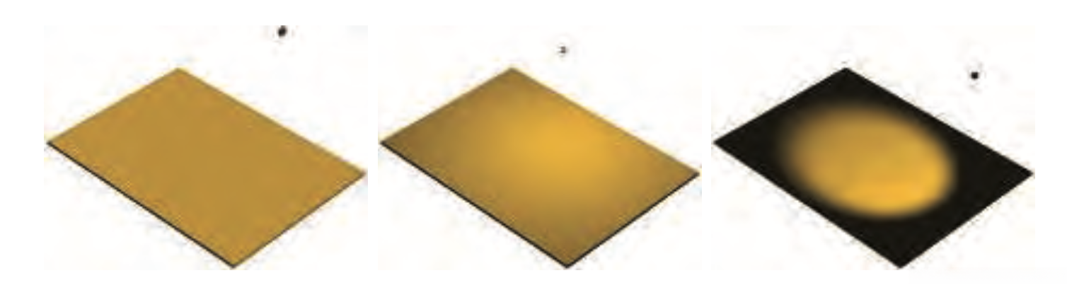 图5.8 光源类型,从左到右依次是平行光,无衰减的点光源,平滑过渡的聚光灯。注意,由于光线和平面的角度变化,点光源朝着边缘变暗。