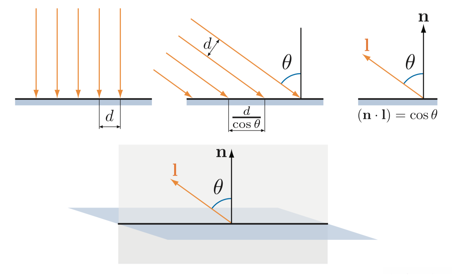 图 5.4 上面一排展示的是光击中表面的横截面的示意图,左图的光线是垂直击中表面,中间图光线以一个倾角击中表面,右图展示的是用向量的点积来计算向量夹角的余弦。下图展示的是在表面上的某一个横截面。