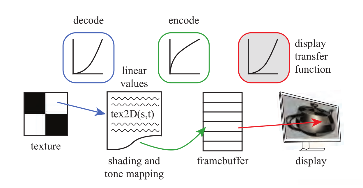 当值被写入到帧缓冲中,用于显示的时候,进行这个转换很重要的。如果在显示编码后进行后期处理(post-processing),这些效果会是在非线性值上进行计算,通常是不正确的效果,也会引起各种瑕疵。显示编码可以认为是一种压缩形式。考虑这个问题的一个好的方式是,用线性值来执行物理计算,并且无论何时我们想显示结果或访问可显示的图像(例如 颜色纹理),我们需要使用合适的编码或解码变换,将数据转换成显示编码形式或将数据由显示编码形式转换回来。