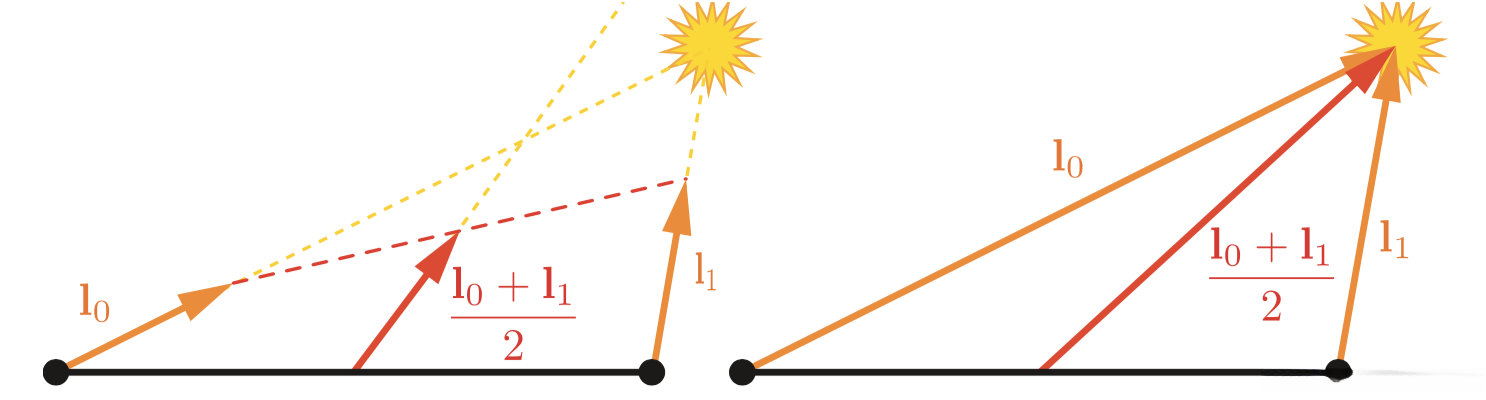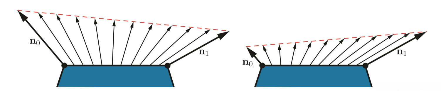 图 5.10 左图可以看到单位法线经过表面插值后会生成长度小于1的插值向量。右图可以看到两个明显长度不一的表面法线经过插值后会发现插值方向偏向于较长法线的方向。