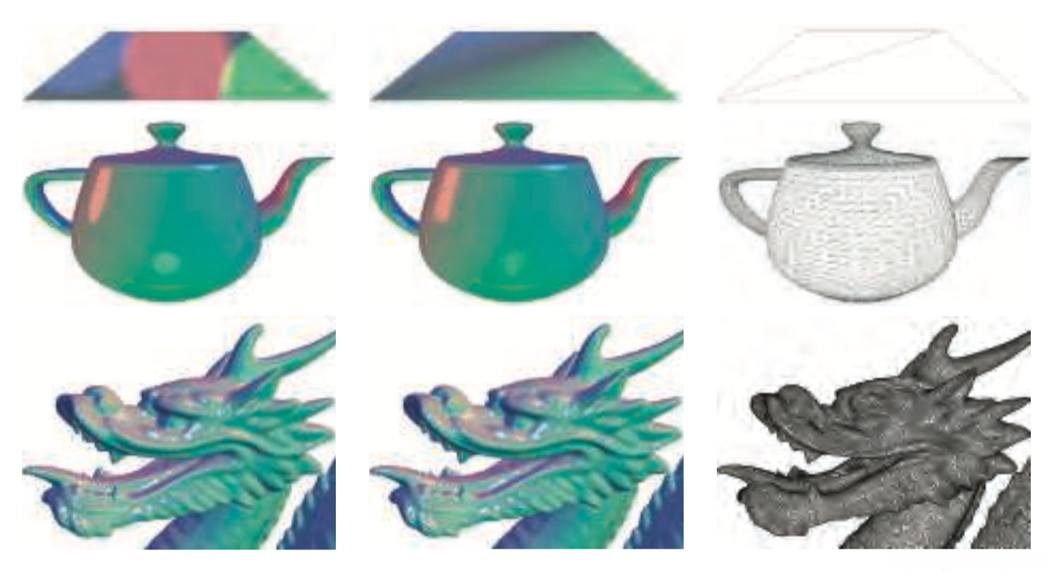 图 5.9 左列显示的是逐像素的评估结果,中间列显示的是逐顶点评估结果,右侧列显示的是每个模型的线框渲染,以展示顶点密度。
