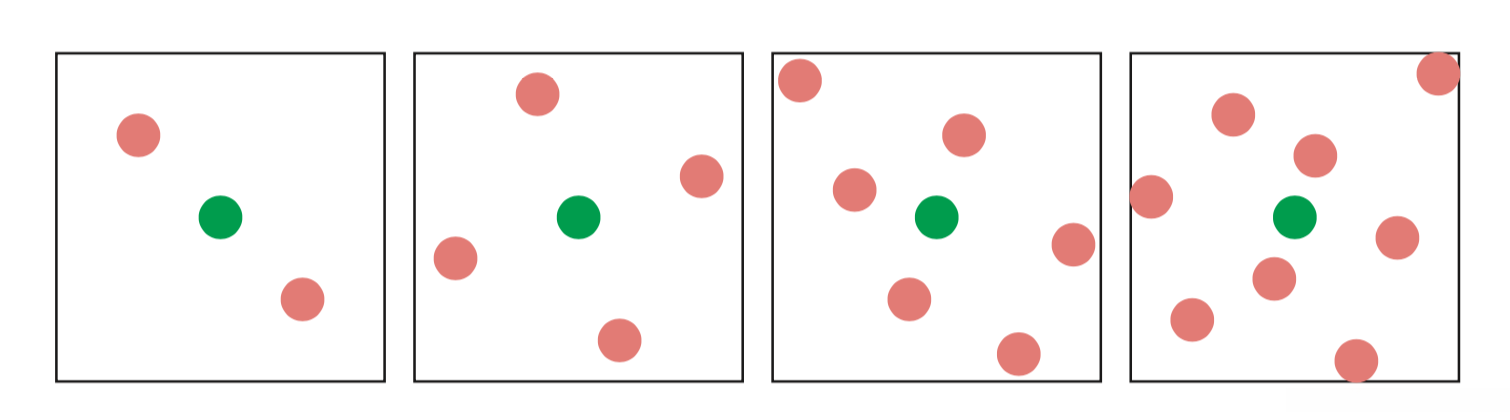 图 5.28 适用于AMD和NVIDIA图像加速的MSAA采样模式。绿色圆点是最终着色采样的位置,红色圆点是计算和保存采样点的位置。从左到右,依次是2x,4x,6x(AMD),和8x(NVIDIA)采样。