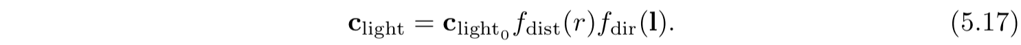 跟点光源不同,几乎现实世界中所有光源的光照都随着方向发生变化,和距离一样。可以用 方向衰减函数 f dir ( l ) 表示,和距离衰减函数一起来定义光强度的整体空间变化:
