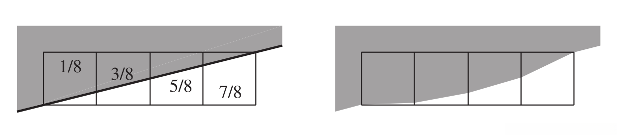 边缘检测的更复杂形式是尝试去找到可能以任意角度包含边缘的像素,并确定它的覆盖。检查周边潜在的边缘,尽可能的重建出原始边缘所在位置。边缘对当前像素的贡献可以用来和相邻像素的颜色进行混合。如图5.30所示。