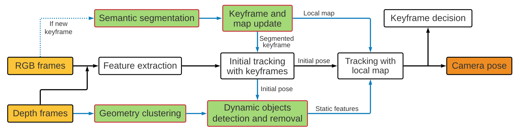 - 仅基于关键帧提取动态对象的语义信息并维护只包含静态特征点的地图用于tracking。