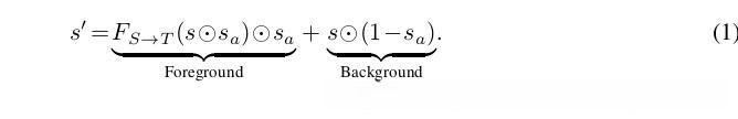 - S域的图像s通过As得到attention map Sa,Sa和s按位乘,得到s的前景(attention 部分)Sf。