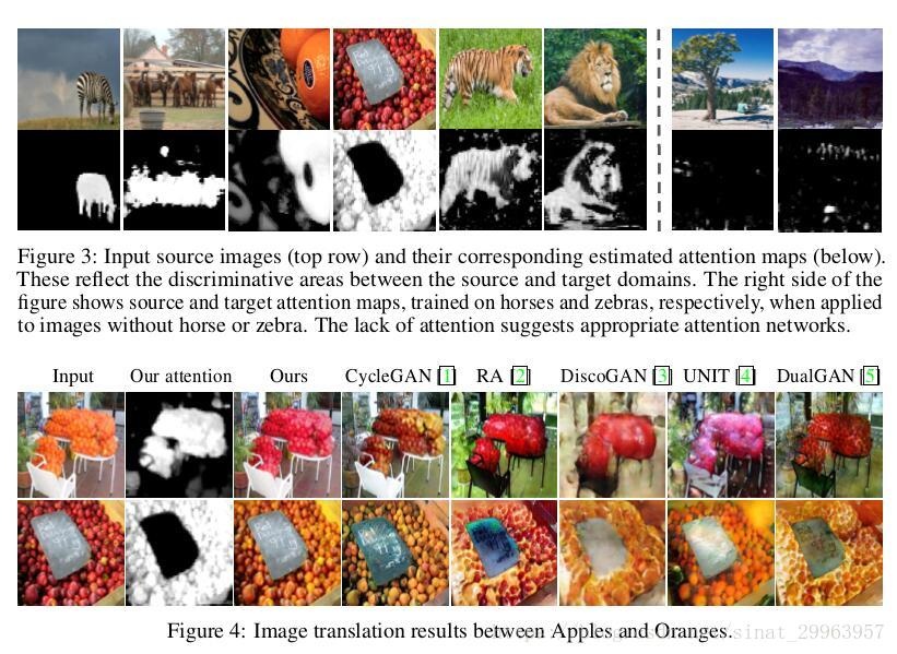Attention network在公式1中起到了非常重要的作用,如果Attention map Sa为全1,相当于Attention 了整个图像,那么整个工作就和CycleGAN一样了,如果Sa为全0那么所有生成的图像都会一样,那判别器就永远不会被欺骗,如果Sa Attention的部分没有一个可以转换的Object(没有Attention到前景)那么s’就会保持原有的域,起不到转换的效果。